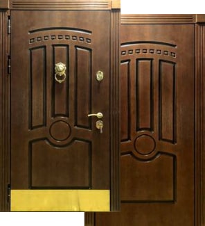 - Элитные, с обеих сторон отделанные MDF шпон под натуральное дерево, с металлическим отбойником, декоративной стучалкой (кнокером) в виде головы льва с кольцом в носу и изысканным резным рисунком.